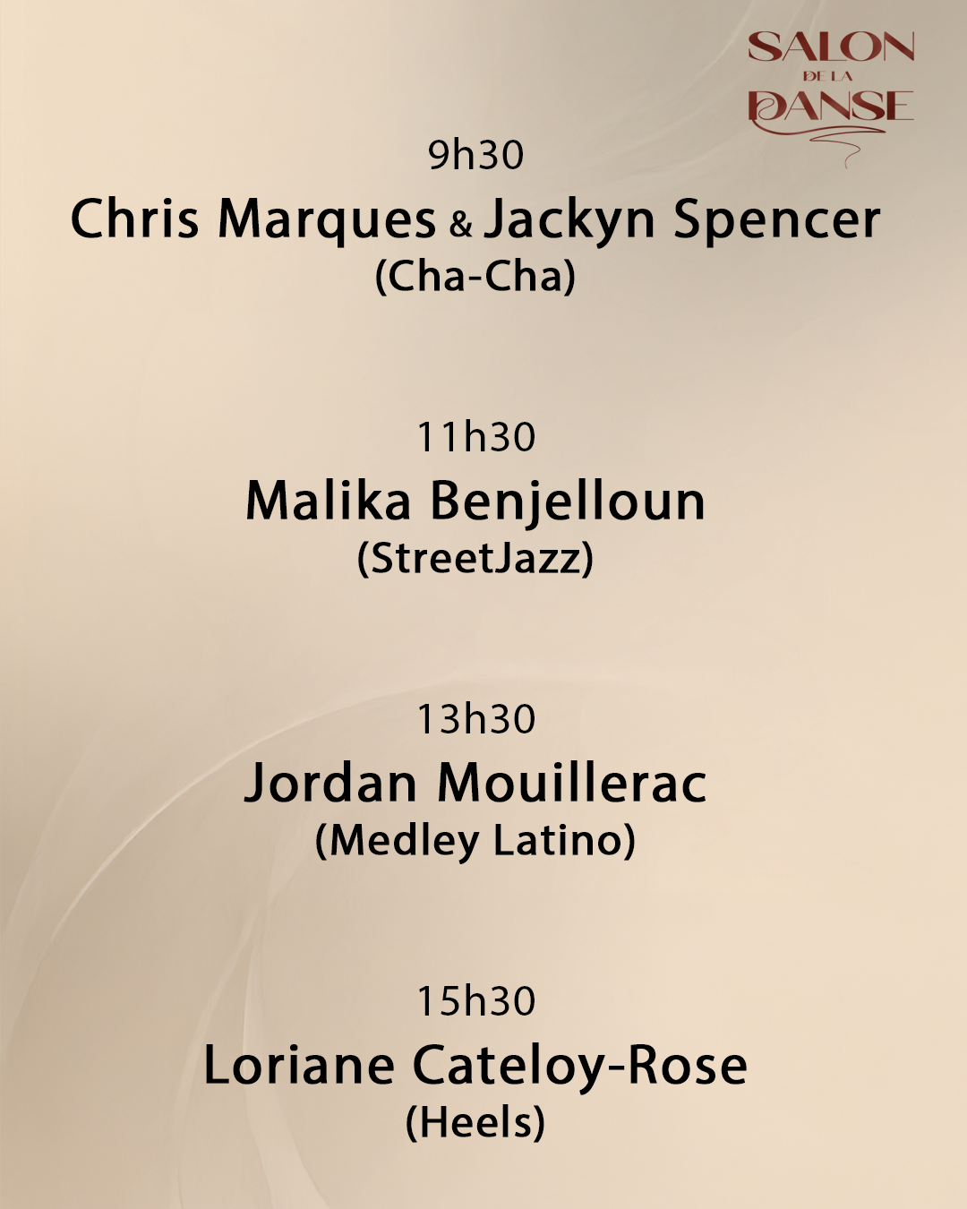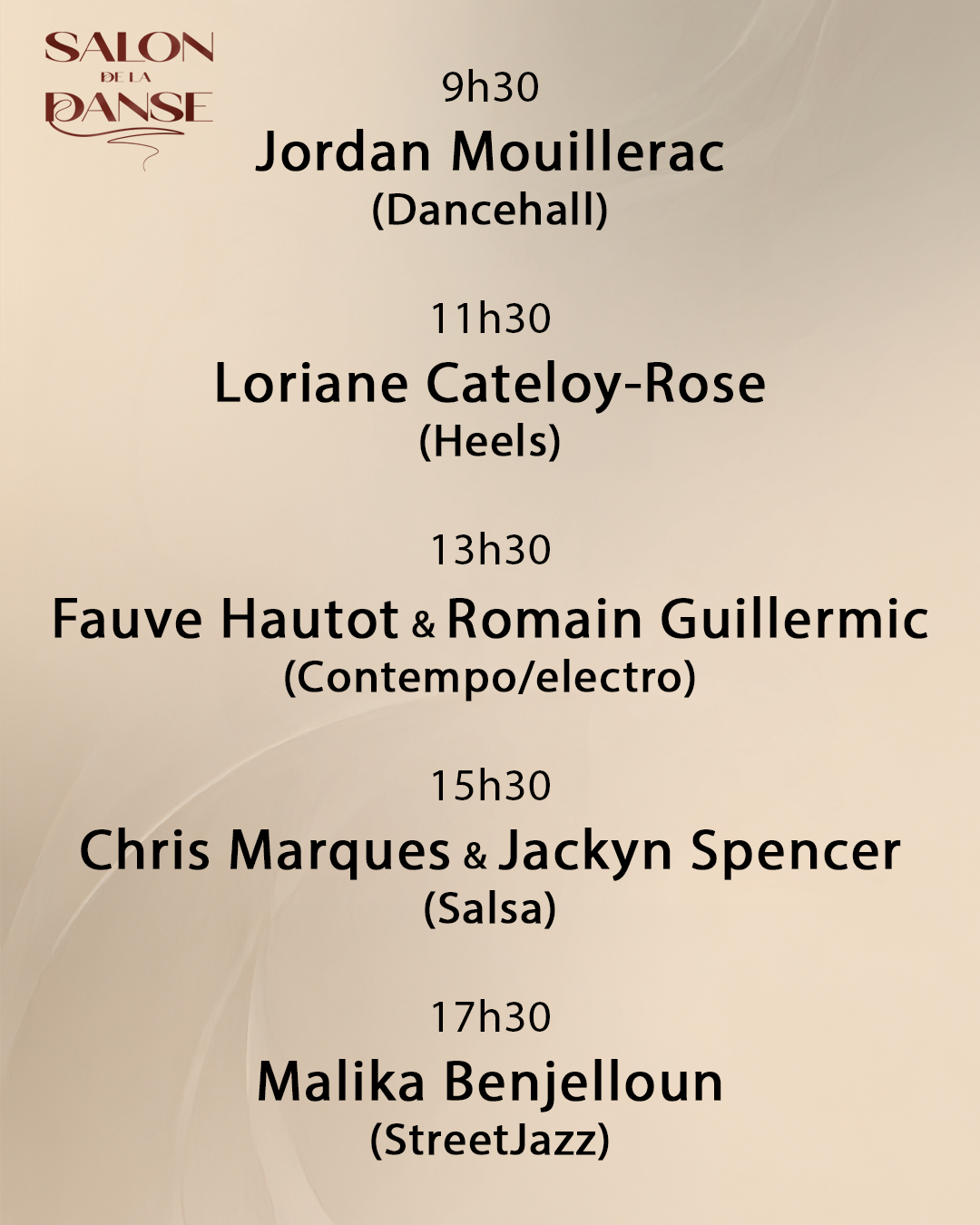 D’une durée de 1h30, elles sont animées par nos invités exceptionnels des professionnels reconnus au niveau national et international et sont limitées à 90 participants maximum, selon le style de danse.